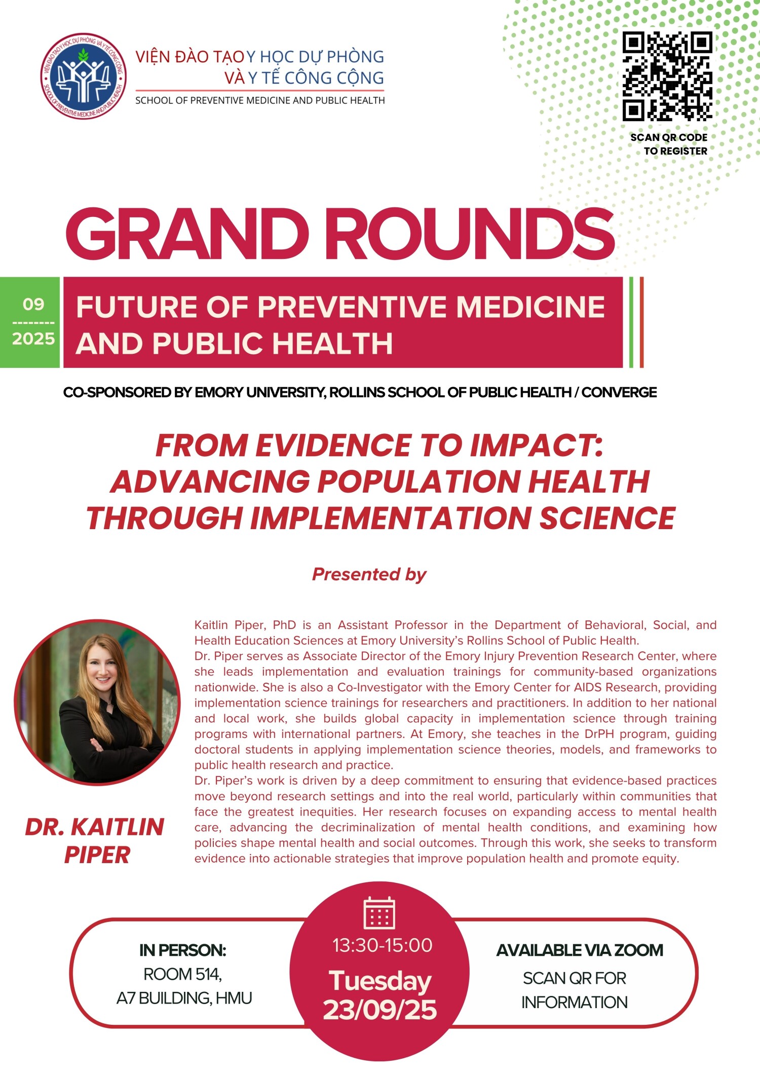 Sự kiện được tổ chức phối hợp với, Rollins School of Public Health / CONVERGE, Đại học Emory, Hoa Kỳ. Chi tiết xin liên hệ Phòng ĐT-NCKH-HTQT: ThS. Nguyễn Thùy Anh (0983855591)