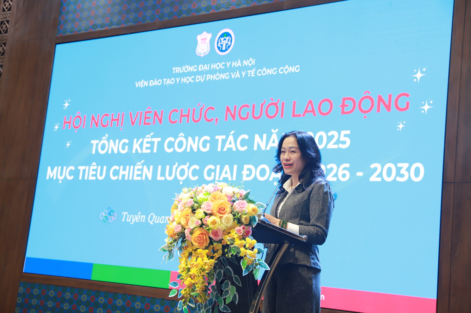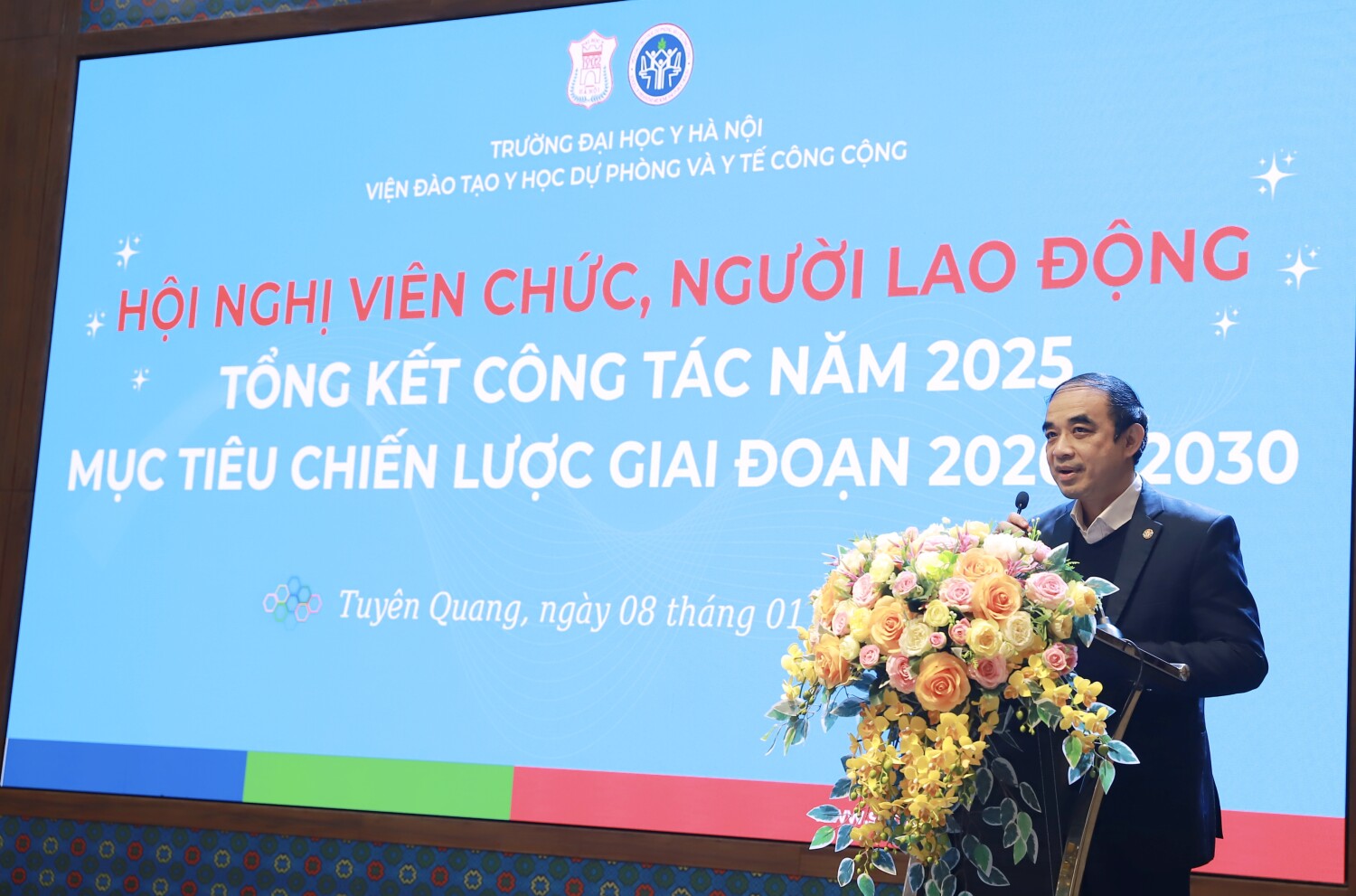 Tại Hội nghị, GS.TS. Lê Minh Giang - Viện trưởng đã trình bày "Dự thảo mục tiêu chiến lược giai đoạn 2026-2030 và nhiệm vụ trọng tâm năm 2026", với định hướng xây dựng Viện Đào tạo YHDP&YTCC trở thành đơn vị uy tín hàng đầu trong đào tạo, nghiên cứu và phục vụ cộng đồng về y học dự phòng và y tế công cộng; có năng lực quản trị phù hợp mô hình “Trường trong Trường Đại học”, hội nhập quốc tế sâu rộng và phát triển tự chủ bền vững. Các mục tiêu giai đoạn 2026–2030 nhằm củng cố thành quả, khắc phục hạn chế của giai đoạn trước, tạo tiền đề cho những bước nhảy vọt trong giai đoạn 2031-2036.