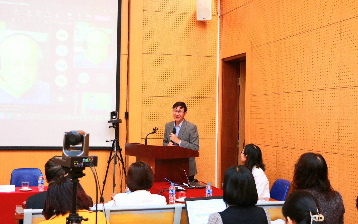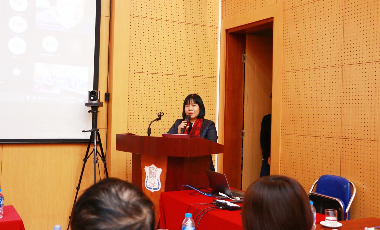 (PGS.TS. Kim Bảo Giang - Phó Viện trưởng Viện Đào tạo YHDP & YTCC trình bày báo cáo tại hội thảo)