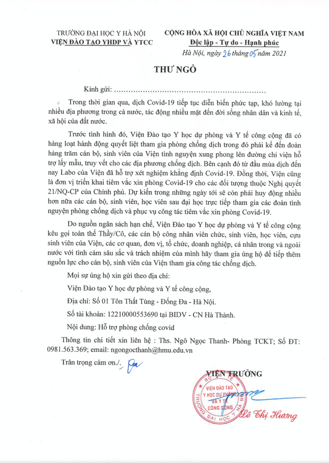 Trước thực tế Viện tiếp tục phải đảm nhiệm phục vụ số lượng người tiêm ngày càng đông, ngày 26/5/2021, Viện trưởng Viện Đào tạo YHDP và YTCC đã có Thư ngỏ kêu gọi mọi người ủng hộ Viện để chống dịch. Trong Thư ngỏ nói rõ: Trong thời gian qua, dịch COVID-19 tiếp tục diễn biến phức tạp, khó lường tại nhiều địa phương trong cả nước, tác động đến nhiều mặt đời sống nhân dân và kinh tế – xã hội của đất nước.